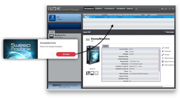 1. In UVI Portal, click **ACTIVATE** on the right of the product to open iLok License Manager (automatically installed with UVI Workstation, Falcon or UVI Effects).